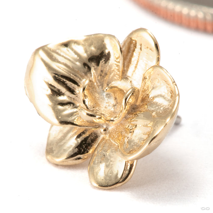 A solid gold orchid balances a bold display of natural beauty with a sophisticated design. This dimensional design measures 8mm by 9mm across and approximately 3mm tall.