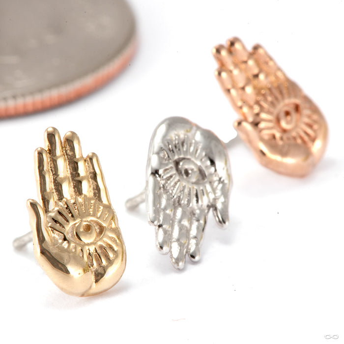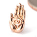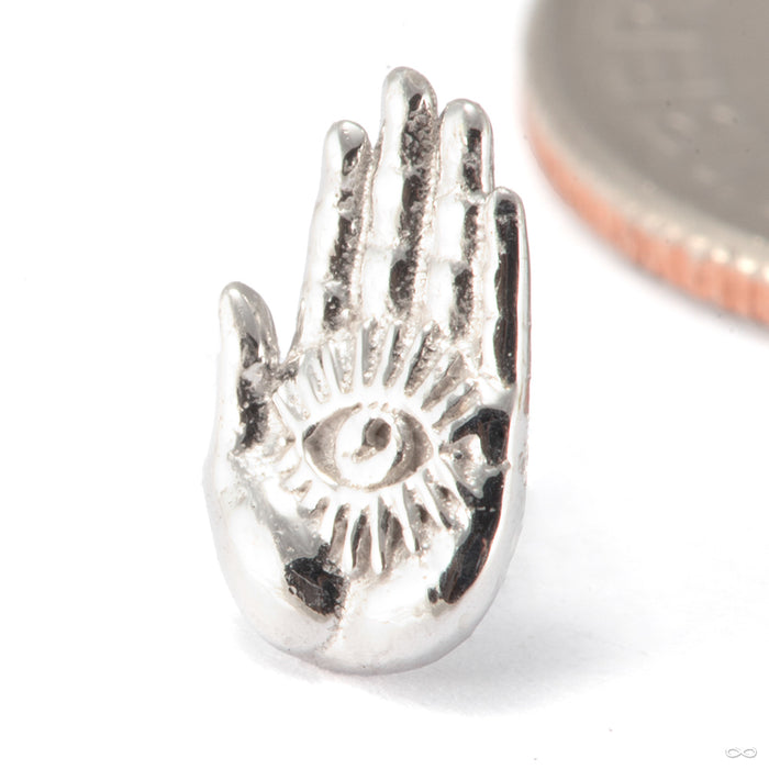 A realistic palm with a symbolic eye situated at its center radiates an arcane power. Measures 5mm by 8mm.